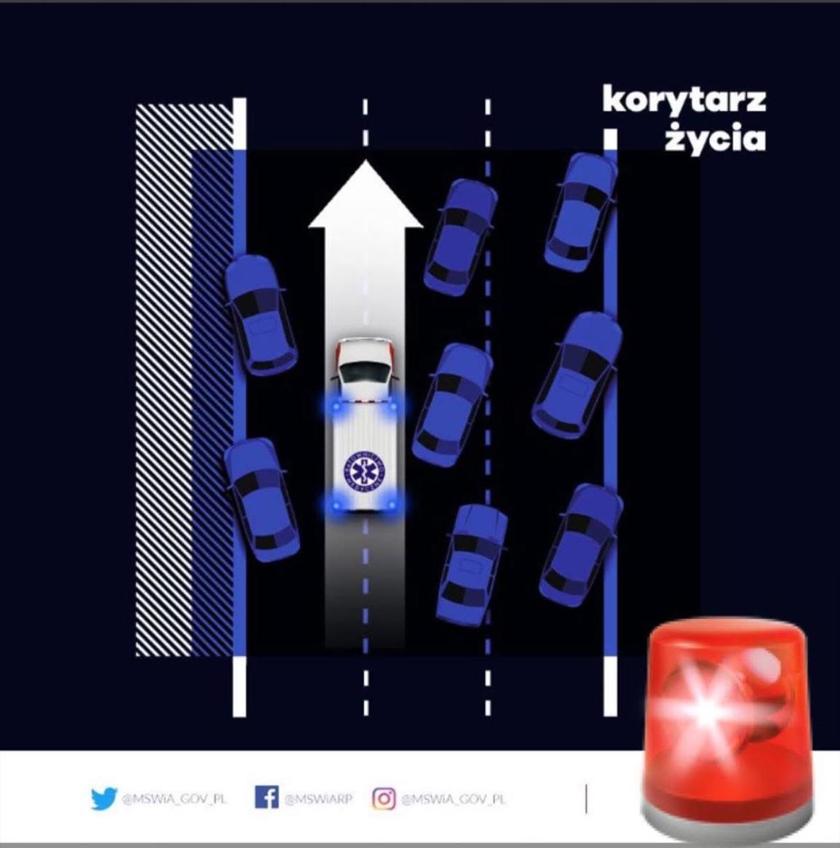 Korytarz życia – gdy słyszysz sygnał karetki, straży pożarnej czy policji, działaj szybko i zgodnie z zasadami.Na drogach wielopasmowych zjeżdżaj: