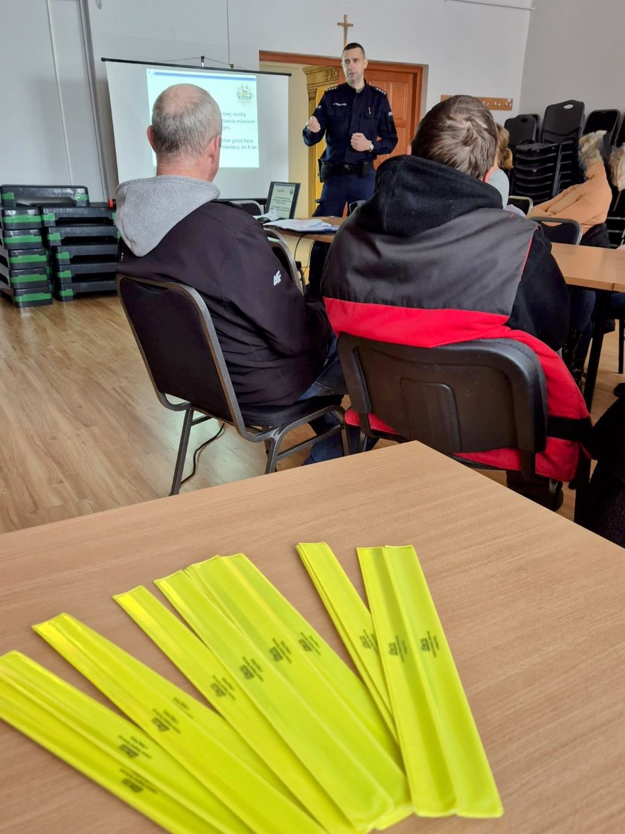 ,,Porozmawiajmy o bezpieczeństwie- możesz mieć na nie wpływ. Nie daj się oszustom” to główny temat spotkania. Dzielnicowy wyjaśnił jak działają dzisiaj oszuści, jakie metody stosują, jakich zasad należy przestrzegać, aby nie dać się oszukać oraz co należy zrobić, kiedy oszust osiągnie jednak swój cel. Mowa też była o bezpieczeństwie na drodze, w tym o znaczeniu elementów odblaskowych dla niechronionych uczestników ruchu drogowego. Na koniec uczestnicy spotkania otrzymali opaski odblaskowe.