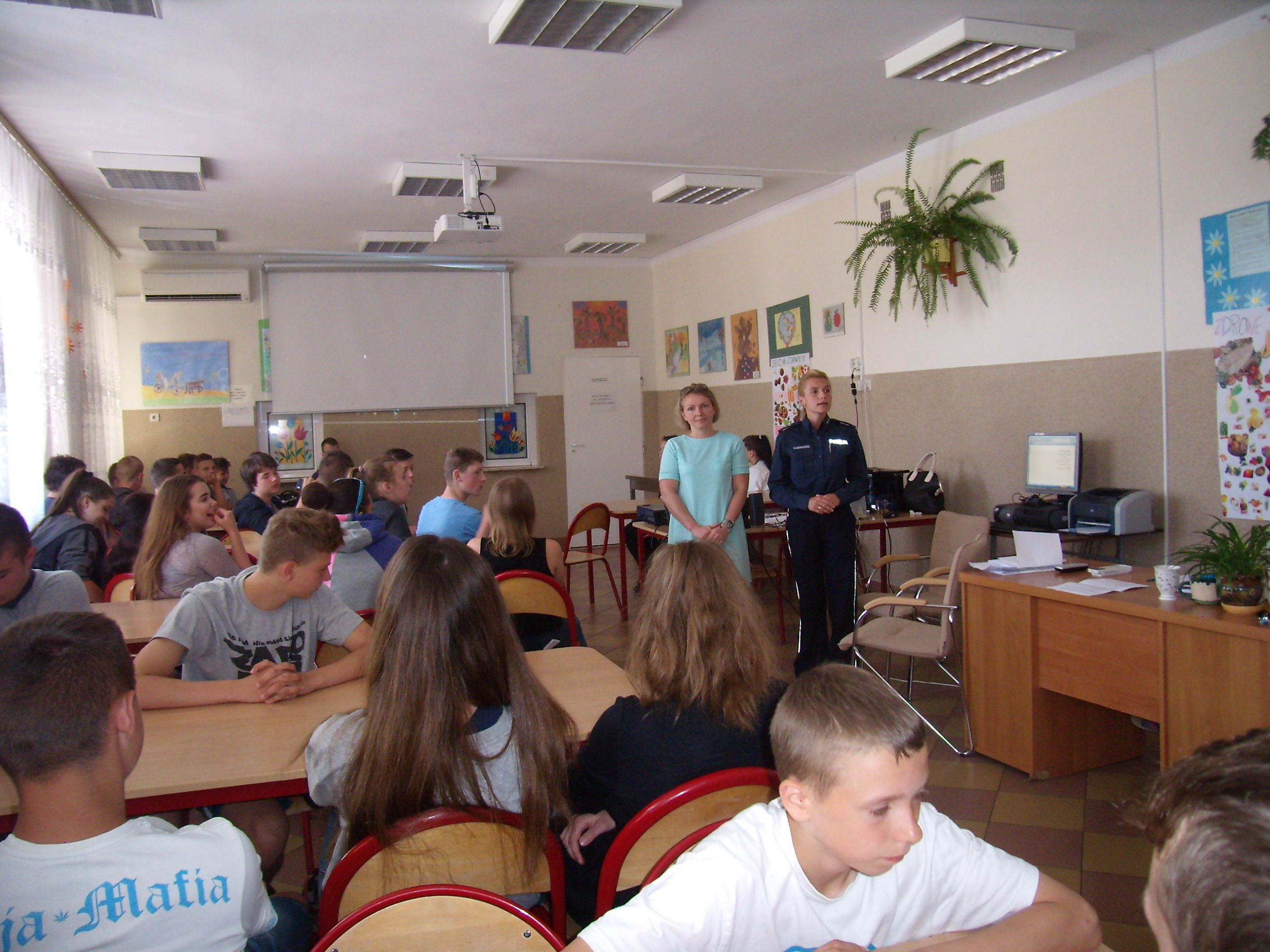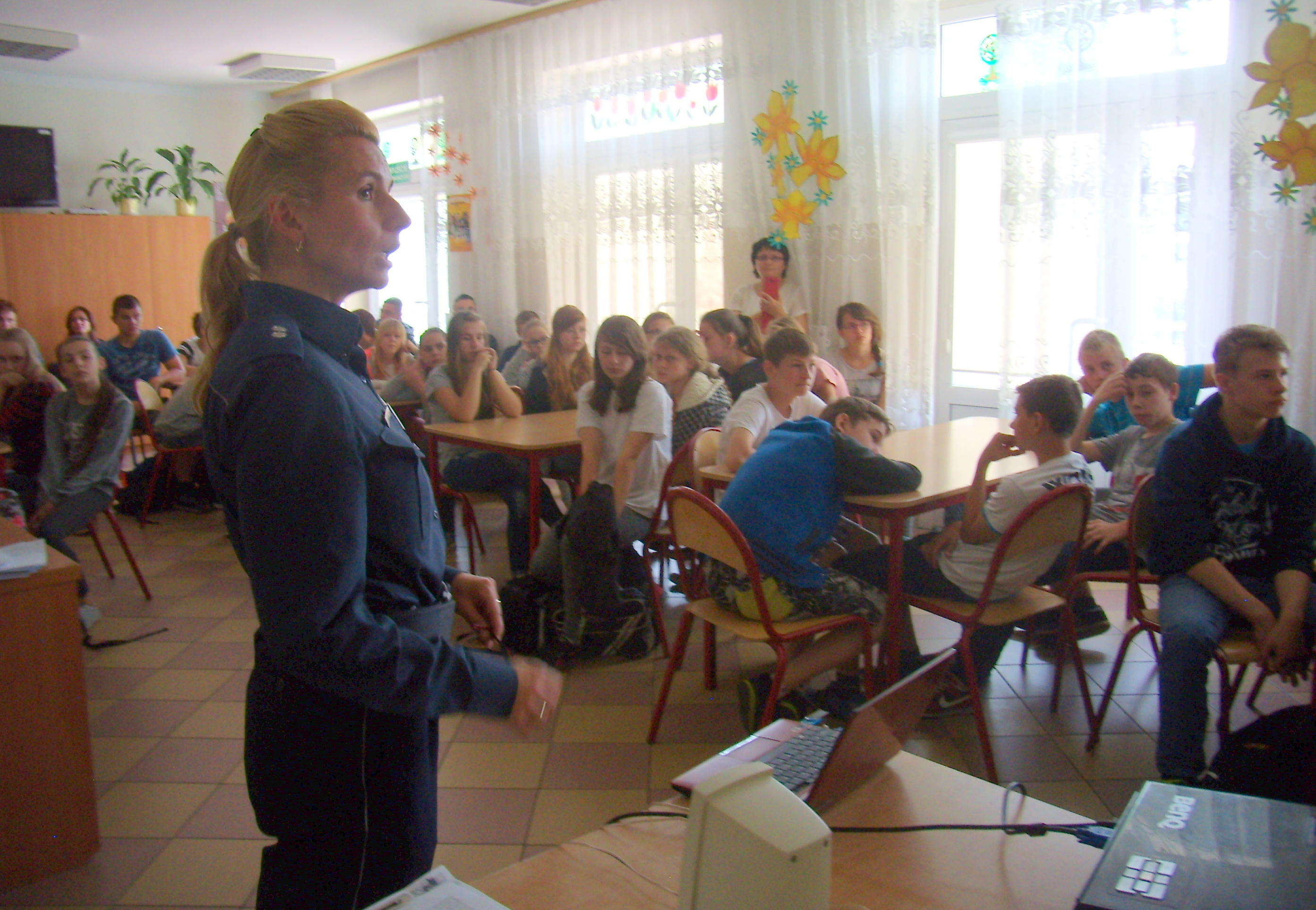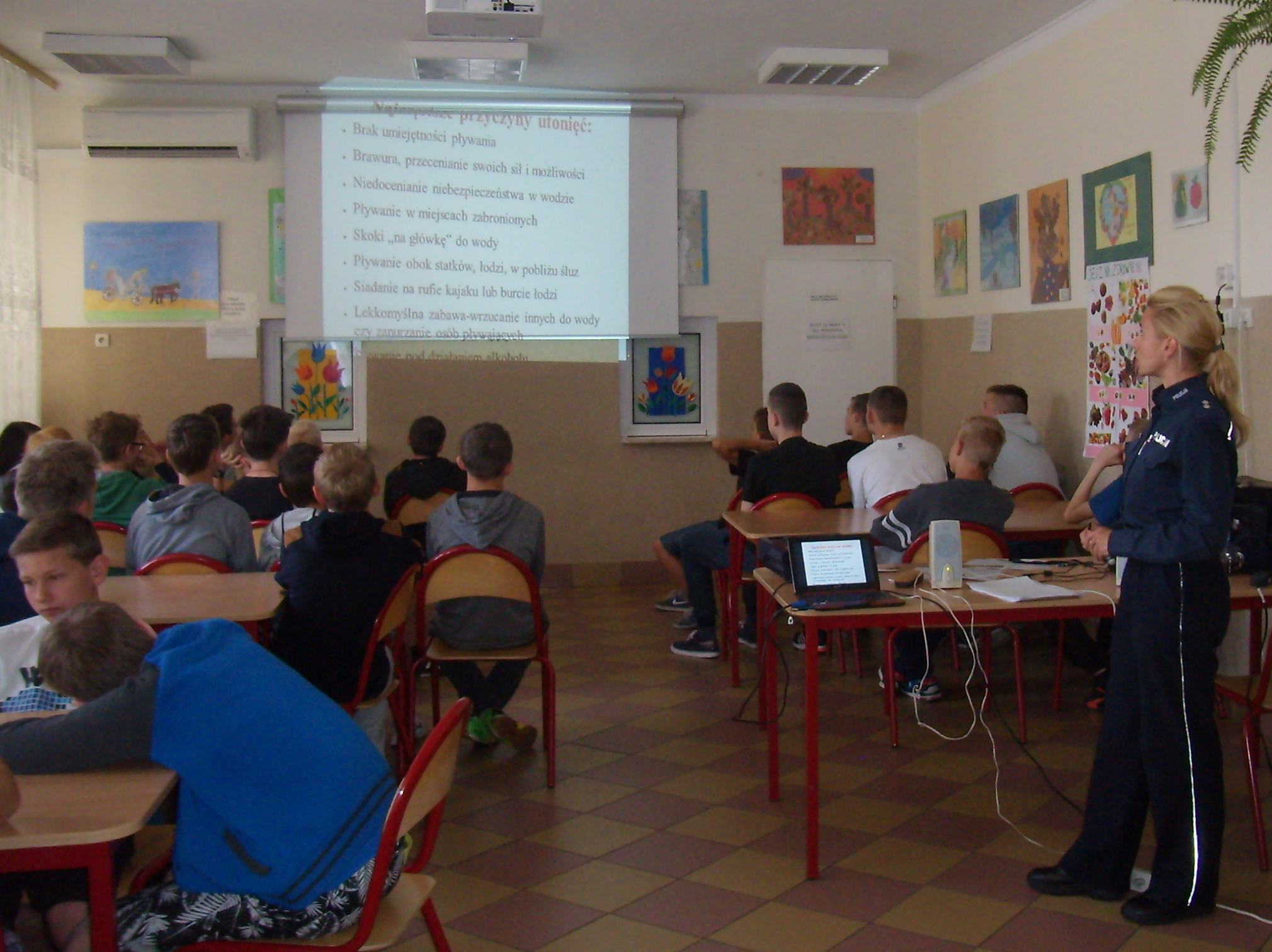 Podkomisarz Anna Szypczyńska rozpoczęła swoją prelekcję od zaprezentowania uczniom spotu opracowanego przez Komendę Wojewódzką Policji w Olsztynie pt. „Zobacz- przeżyj”. Film ten zrobił na młodzieży ogromne wrażenie i wprowadził w tematykę spotkania. Następnie policjantka przypomniała uczniom o podstawowych zasadach, o których nie można zapominać podczas wypoczynku latem. Dużo uwagi poświęciła zagadnieniom dotyczącym bezpiecznego wypoczywania nad wodą. Tu przypomniała, jak niebezpieczne jest pływanie po alkoholu, czy skoki do wody „na główkę”. Na koniec uczniowie mieli możliwość obejrzenia krótkiego filmu, gdzie o swoim życiu opowiada młody człowiek, który wiele lat temu bezmyślnie skoczył do wody, a teraz ponosi tego konsekwencje będąc przykuty do łóżka.