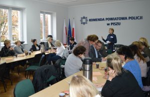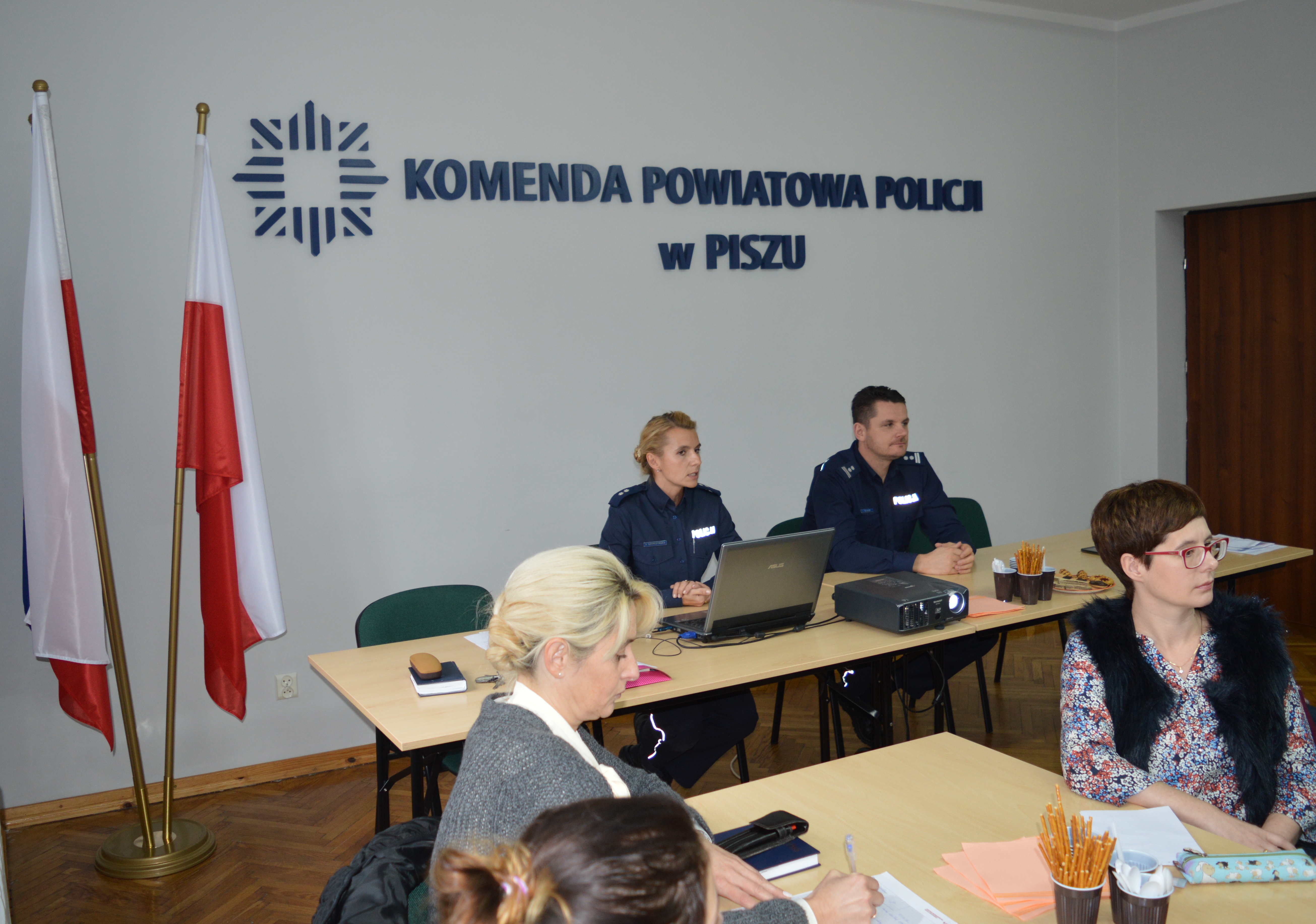 W kolejnej części policjanci zaprezentowali harmonogram działań profilaktycznych realizowanych przez Komendę Powiatową Policji w Piszu w bieżącym roku szkolnym. Zachęcali tym samym pedagogów do współpracy we wszelkich inicjatywach mających na celu poprawę bezpieczeństwa w szkole oraz w jej okolicach.
