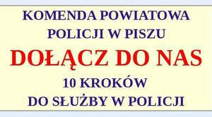 Ofertę służby w Komendzie Powiatowej Policji w Piszu kierujemy zarówno do osób, które dopiero stoją u progu podjęcia decyzji o rozpoczęciu swojej kariery zawodowej, jak i do tych, które mają już za sobą ten etap i chcą coś zmienić w swoim życiu. Wystarczy zrobić zaledwie 10 kroków, by zostać policjantem. Gwarantujemy: atrakcyjne zarobki, stabilne warunki pracy i możliwość rozwoju.